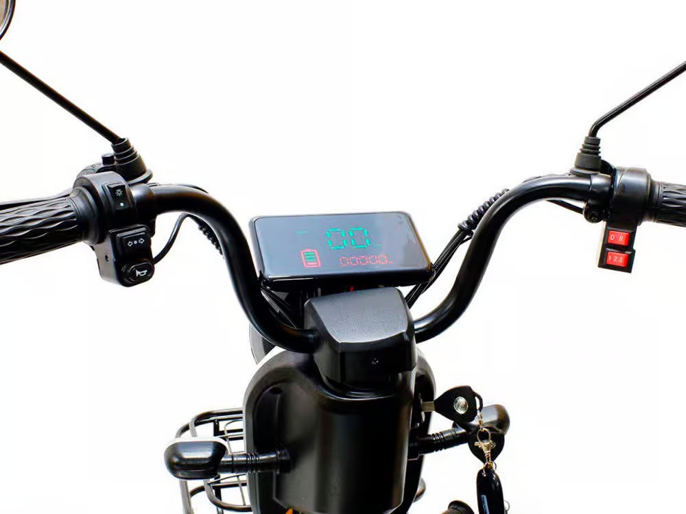 Имеет вместительную прямую платформу для ног, широкое и мягкое водительское сиденье и дополнительное мягкое сиденье со спинкой для пассажира.Прочная стальная рама рассчитана на максимальную нагрузку до 150 кг (выдержит двух взрослых человек). С электроскутером идет ключ зажигания и брелок для управления сигнализацией (два комплекта). У электроскутера мягкая подвеска т.к. установлен передний и задний амортизатор, что делает езду по грунтовой дороге с корнями и ямами очень комфортной. В скутере предусмотрены педали. При их помощи можно доехать до места назначения, как на обычном велосипеде, если так случится что у вас сядет аккумулятор. Электроскутер полноразмерный, водитель с ростом 190см будет чувствовать себя комфортно, места для ног предостаточно. Электроскутер будет незаменимым помощником в небольших населенных пунктах, где нет заправочных станций и запасать бензин в канистрах неудобно. Электроскутер чем-то похож на мобильный телефон, где владелец ставит его на зарядку по прибытию и не обременен пользоваться заправками. Также он намного экономичнее бензиновых скутеров. Электроскутер оснащен звуковым сигналом, поворотниками, зеркалами заднего вида, яркой линзованной фарой и большим цветным экраном типа “Планшет”. Для фиксации скутера на стоянке предусмотрены два вида подножек. Лапка для быстрой и удобной фиксации и подножка для четкой вертикальной фиксации под задним колесом. В электроскутере есть три скоростных режима, где первый это самый безопасный режим, а третий скоростной.