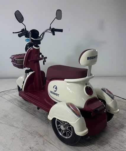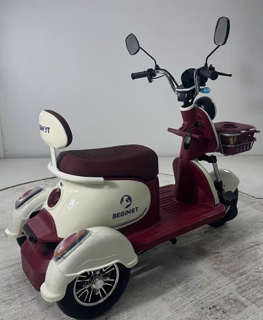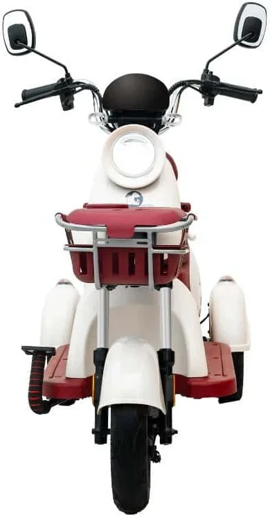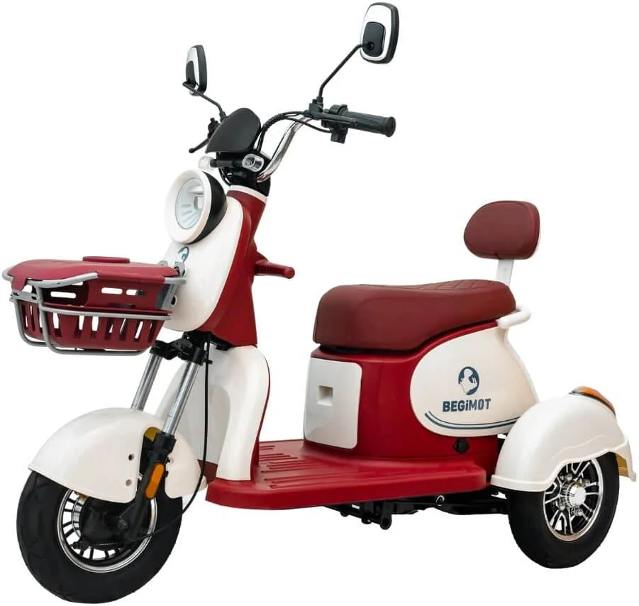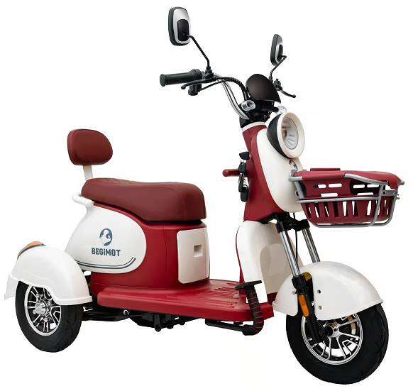 Трехколесный электроскутер Begimot Trio Elegance — это трехместный электроскутер трицикл с аккумулятором 48v20Аh и мотором на 250W. Его дальность пробега до 50 км.
