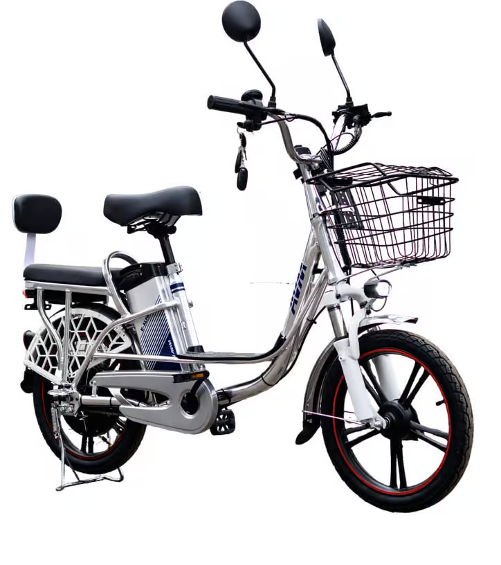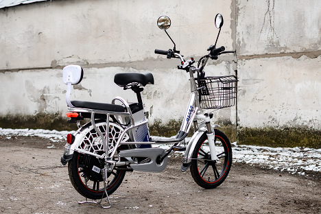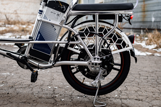 - Велосипед оборудован сиденьем для второго пассажира, общая грузоподъемность до 150 кг. Вместо сиденья со спинкой при использовании велосипеда в службе доставки, можно установить площадку для крепления бокса доставки.