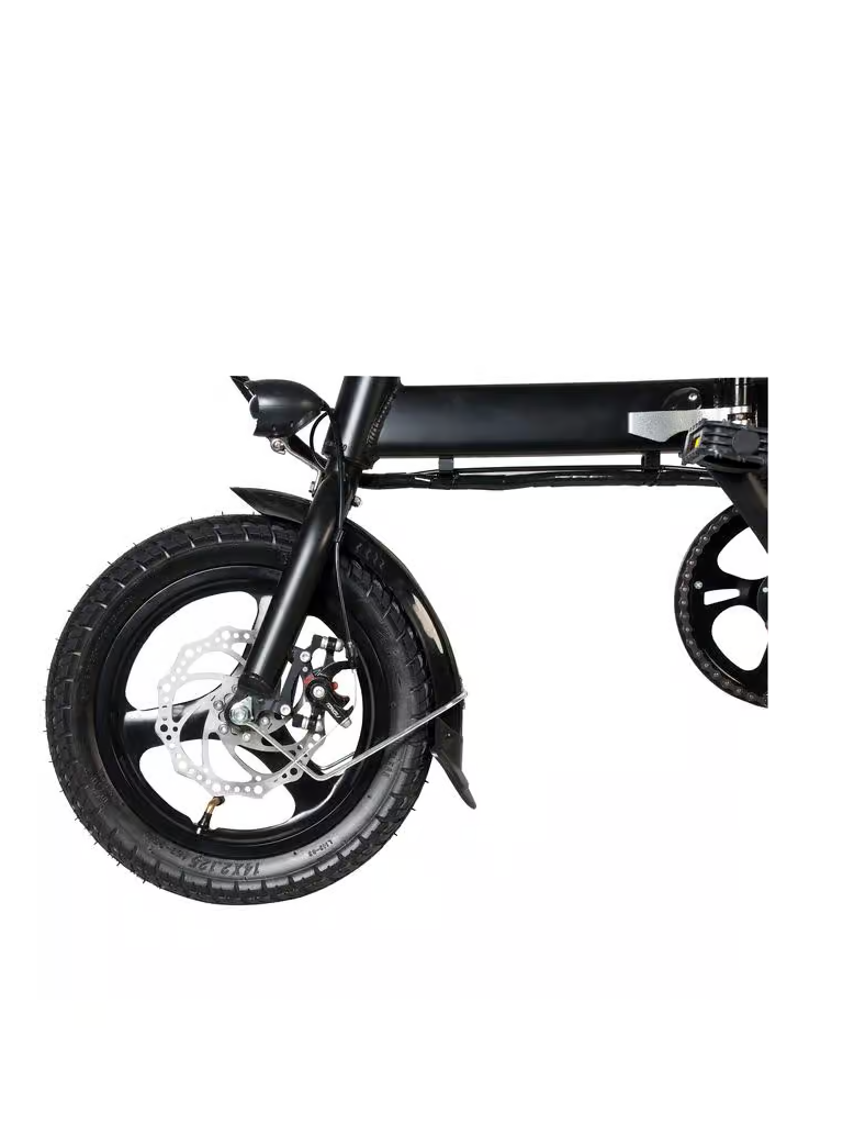 - Электровелосипед оснащен колесами диаметром 14 дюймов с бескамерной шиной. Для езды в темное время суток производитель укомплектовал данную модель яркой передней фарой, светящимся задним габаритом, и набором катафотов.